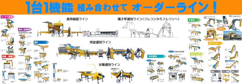 各々の特徴のある機器を組み合わせる事で用途に応じたオーダー選別ラインを作る事ができます。